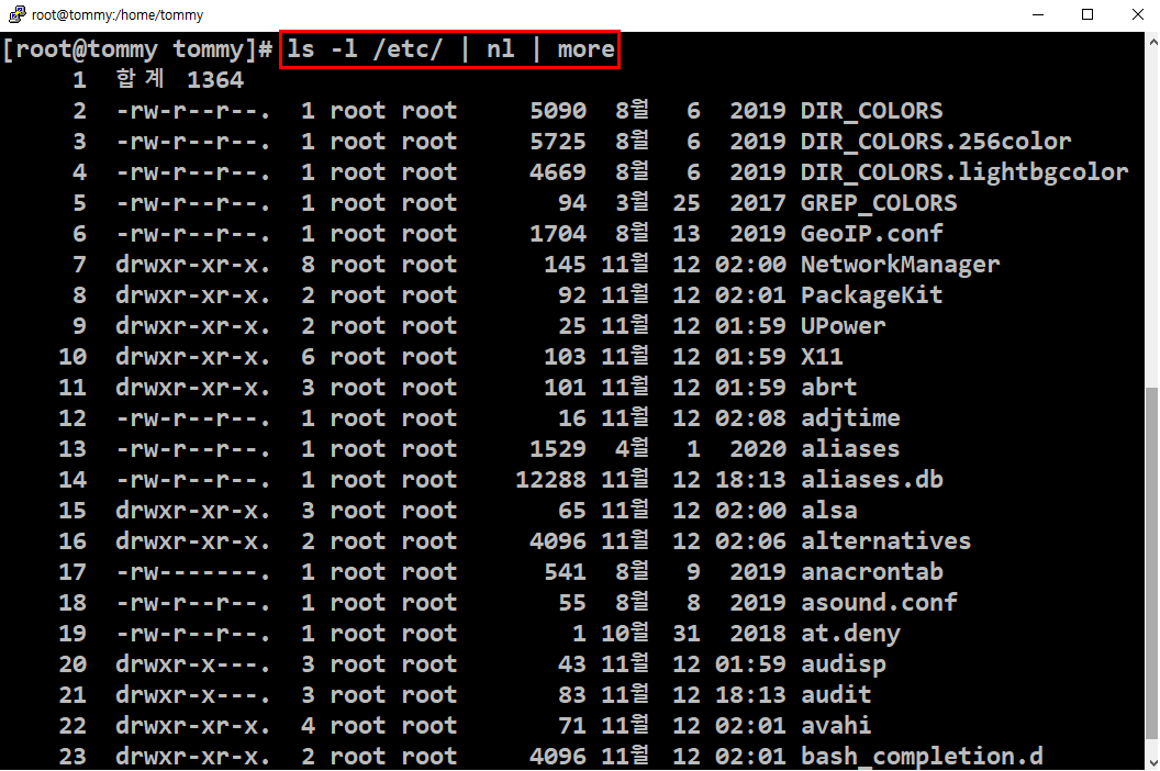 위에 그림화면처럼 'ls -l /etc/ | nl | more'를 치면 more 방식으로 순서대로 etc에 있는 파일과 디렉토리를 보겠다라는 뜻이 됩니다.