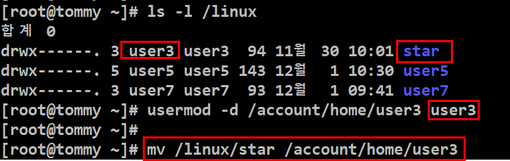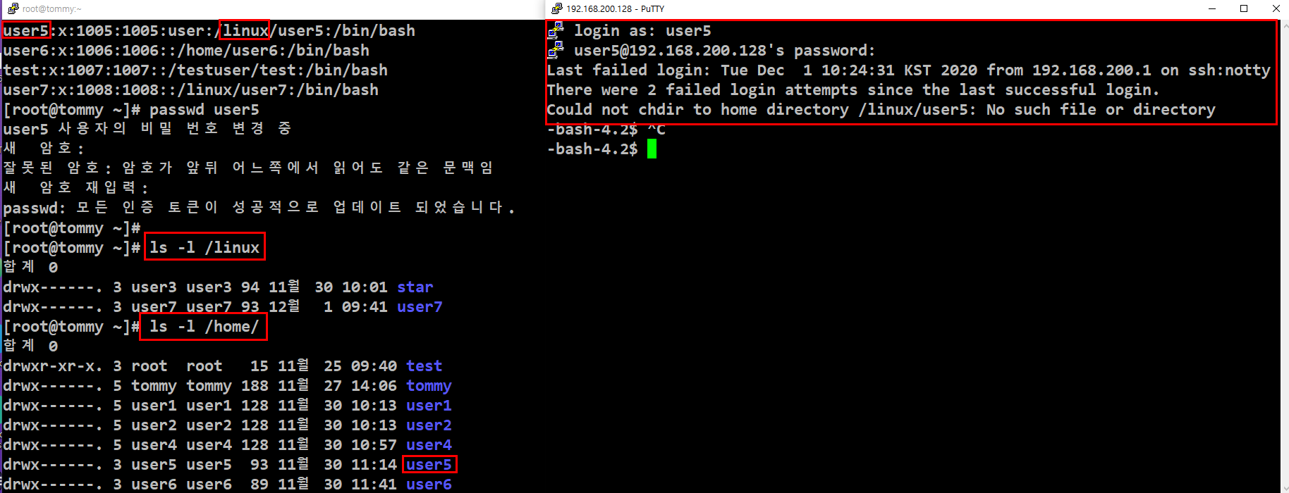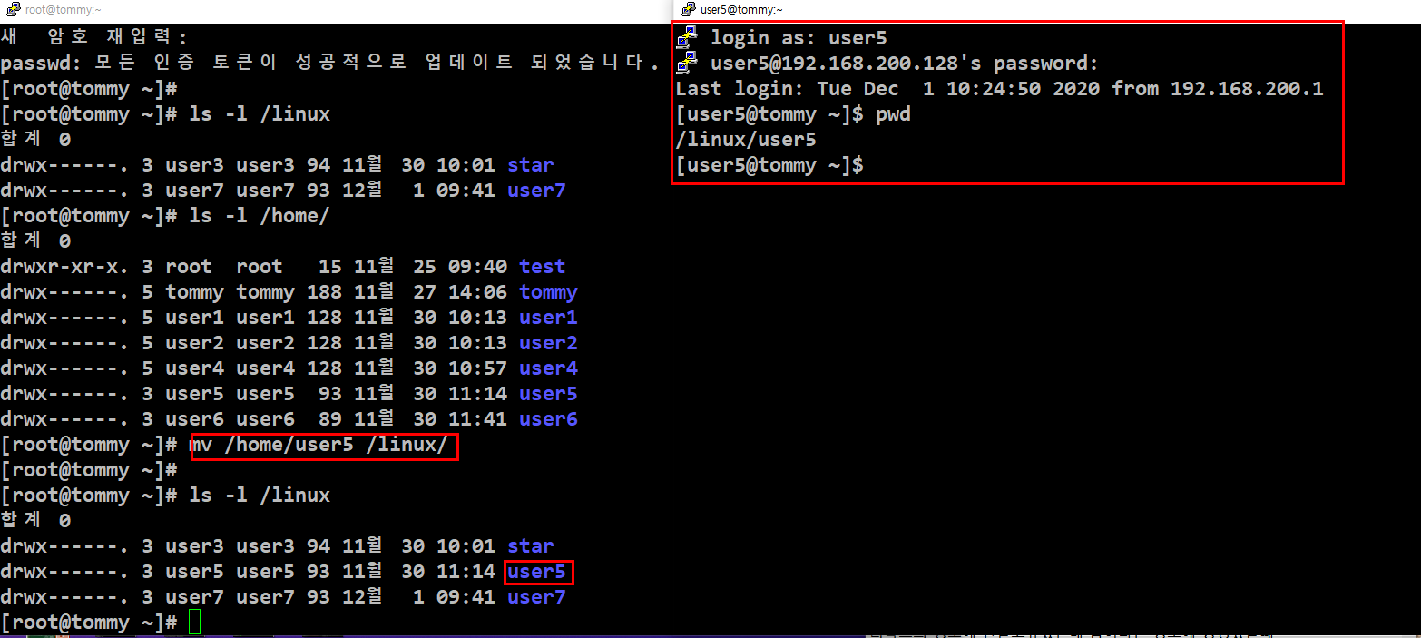 위에 사진처럼 'mv'명령어를 이용하여 '/home/user5'를 '/linux'에 옮긴 후 로그인을 하면 정상적으로 로그인이 되는것을 확인할 수 있습니다.