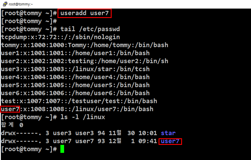 변경 후 새로운 사용자 'user7'를 생성해보니, 사용자 홈디렉토리가 '/linux'로 자동생성된 것을 볼 수 있습니다.