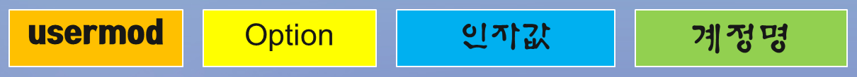 사용자 정보수정 명령어 'usermod'는 'useradd'와 사용형식은 동일하며, 단지 'useradd'는 사용자를 생성, 'usermod'은 사용자의 정보를 수정하는 차이 입니다.