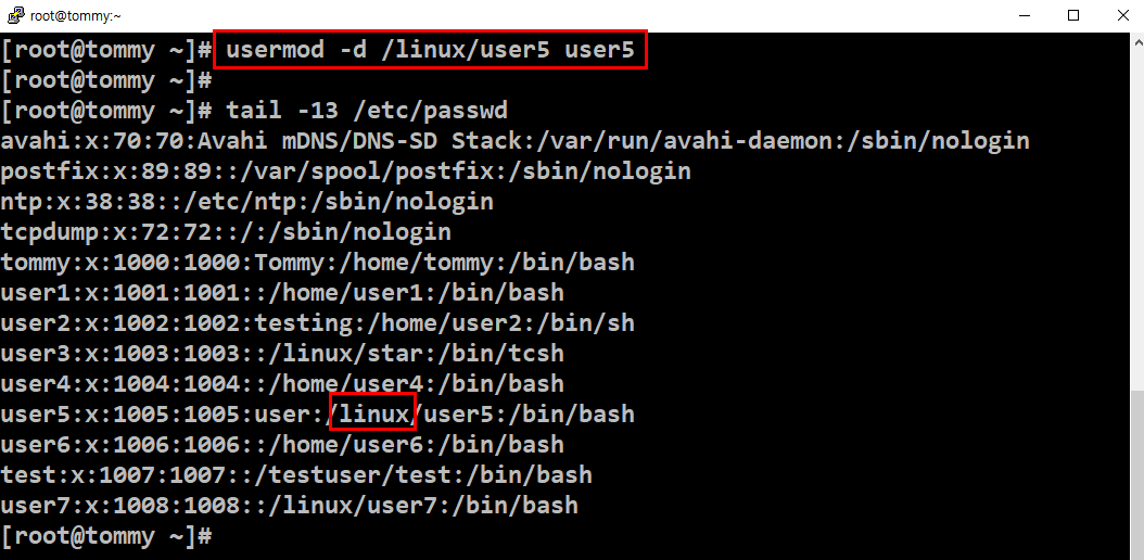 특정 사용자의 홈 디렉토리 경로를 변경하려면 옵션 '-d'를 사용하여 변경할 수 있습니다.