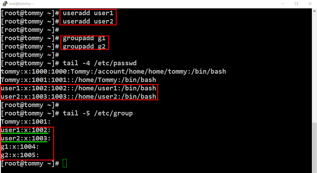 'user1', 'user2'라는 두 계정을 생성하고, 'g1', 'g1,라는 두 그룹을 생성하였습니다.