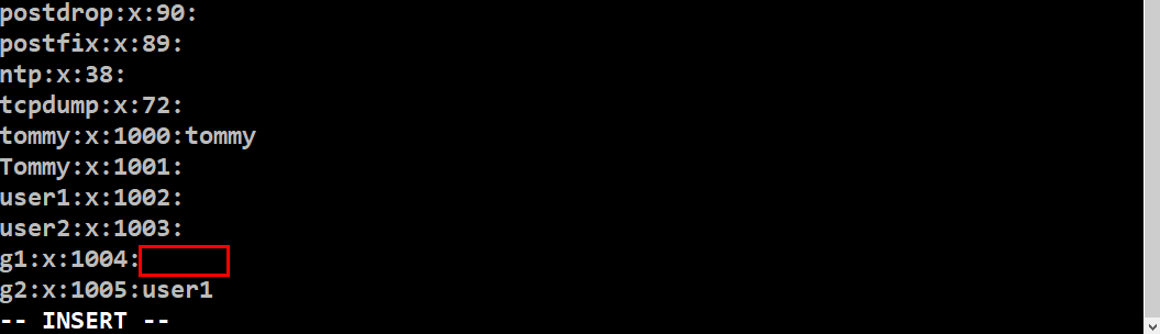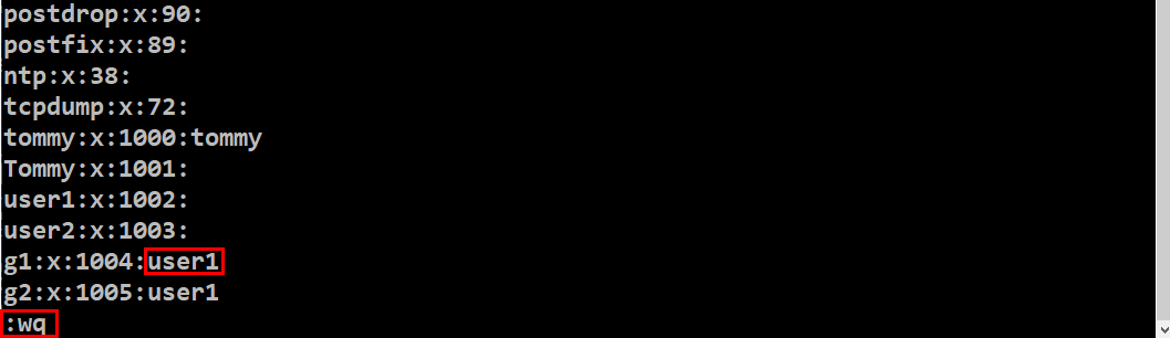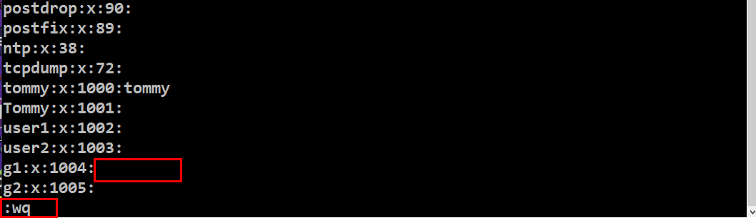 대문자 G를 클릭하여 편집기의 전체 문서의 하단에 내려와 'g1'이라는 그룹에 속해있는 'user1'를 삭제해줍니다.