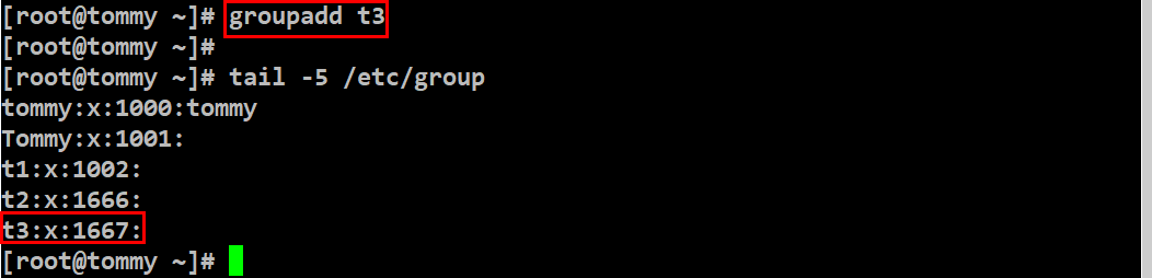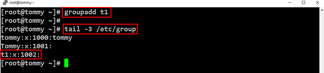 't1'이라는 그룹을 생성한 후에 '/etc/group'에서 확인해보니 생성이 된 것을 확인할 수 있습니다. 그룹도 사용자와 마찬가지로 생성시에 1000번부터 순차적으로 순번이 생기는것을 알 수 있습니다.
