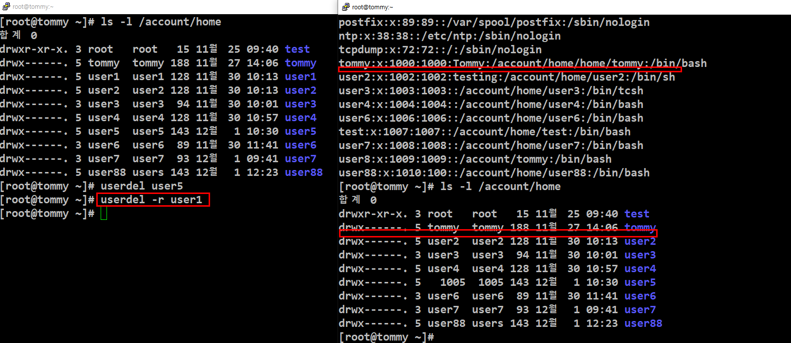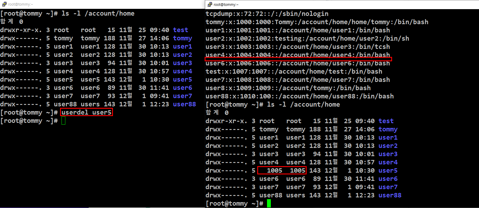 'userdel user5'를 입력하여 'user5' 계정을 삭제했더니 삭제는 되었는데, 계정이 있던 홈디렉토리에는 'user5'라는 흔적이 남아 있습니다.