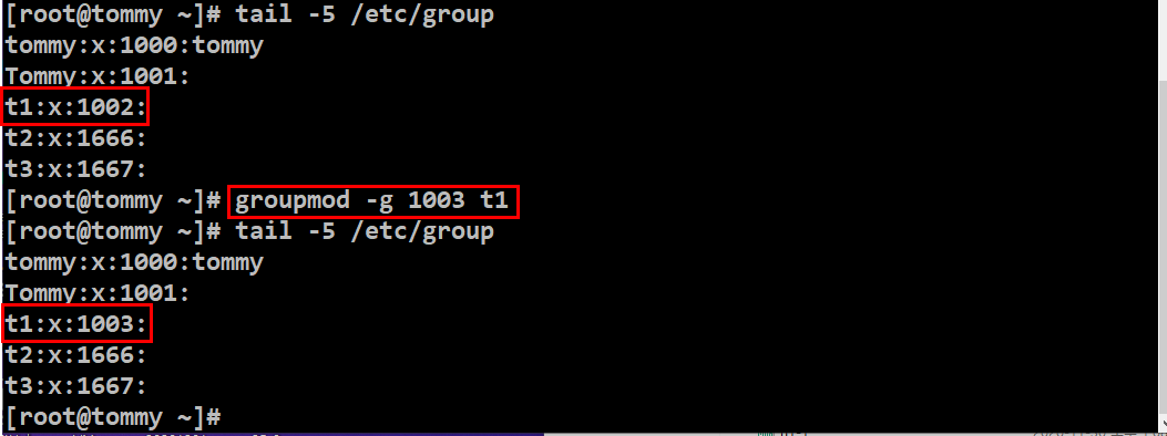 위에 사진처럼 1002라는 그룹에 속해있는 't1' 사용자의 그룹을 'groupmod -g'를 사용하여 1003으로 변경한 것을 알 수 있습니다.