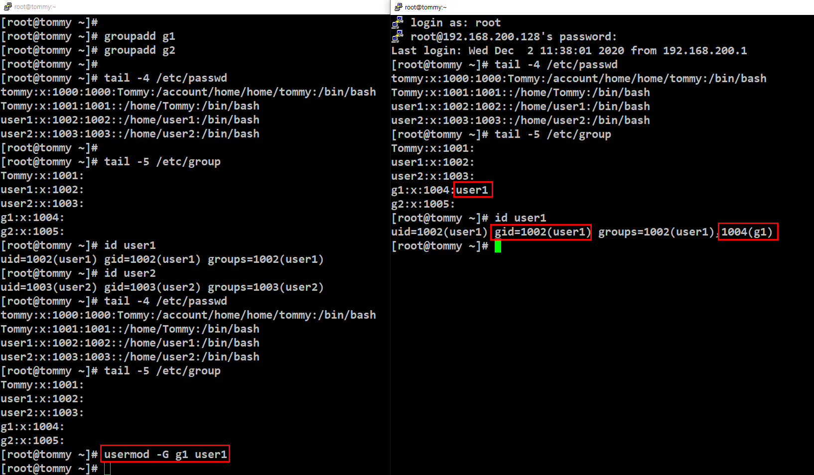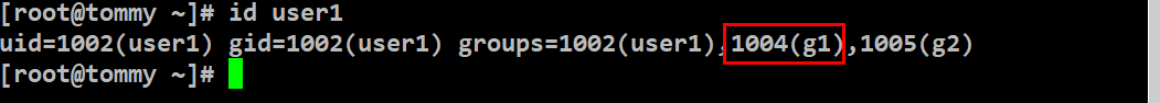 'usermod -G g1 user1'를 입력하여 'user1'을 'g1'그룹에 포함시키도록 명령하고 확인해보니 우측에 확인한 것처럼 '1004번째 그룹인 g1'에 'user1'이 추가로 속해있으서 최종적으로 2개의 그룹에 속해있는 것을 볼 수 있습니다.