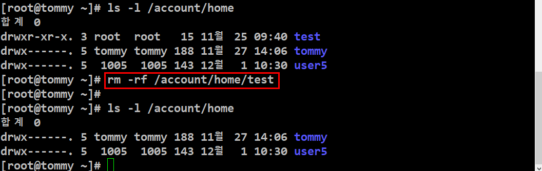 'rm -rf'를 이용하여 삭제하면 위에 사진처럼 삭제가 됩니다.