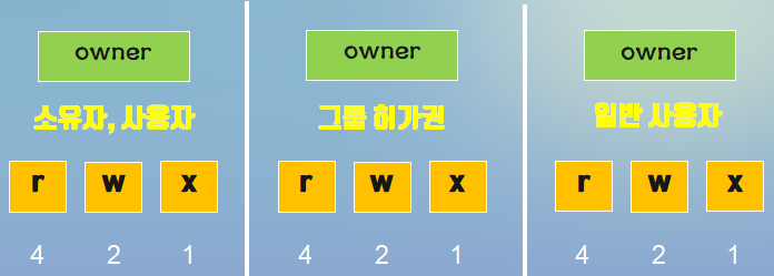 기본적으로 'rwx'가 3번 반복되는 것으로 이루어져 있으며, 'r' = '4' 'w' = '2' 'x' = '1'로 계산 하며