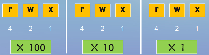첫번째 'rwx'에는 'x100'을 하며 두번째 'rwx'는 'x10'을, 마지막 'rwx'에는 'x1'을 하여 최종 합이 '777'이 나오는
