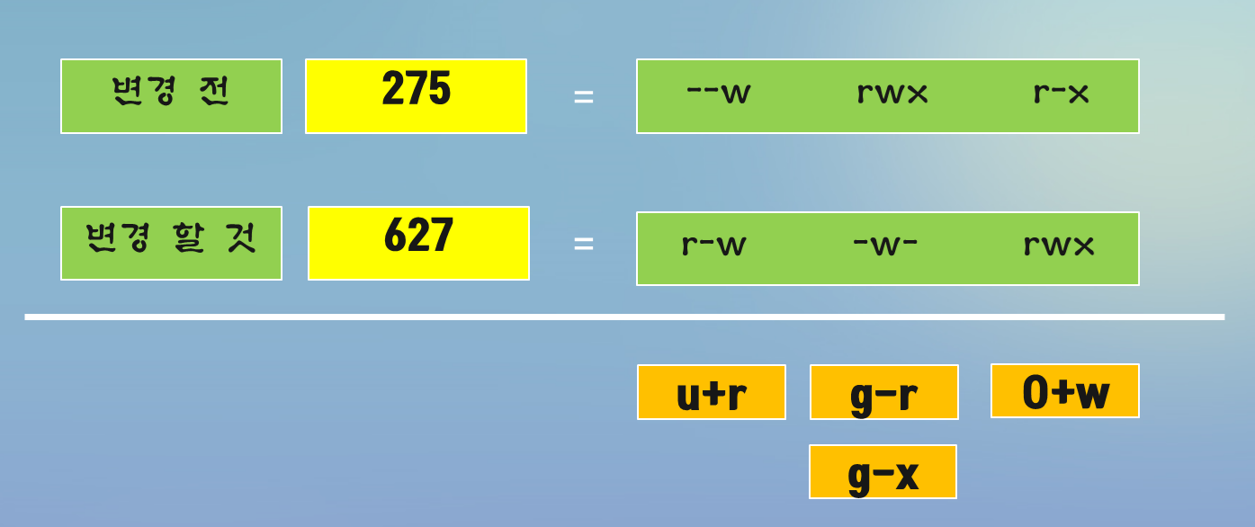 변경하기 전 허가권에서 변경할 허가권에 추가해야하거나 빼야할 것을 문자로 표시해서 명령어와 함께 입력하면 됩니다.
